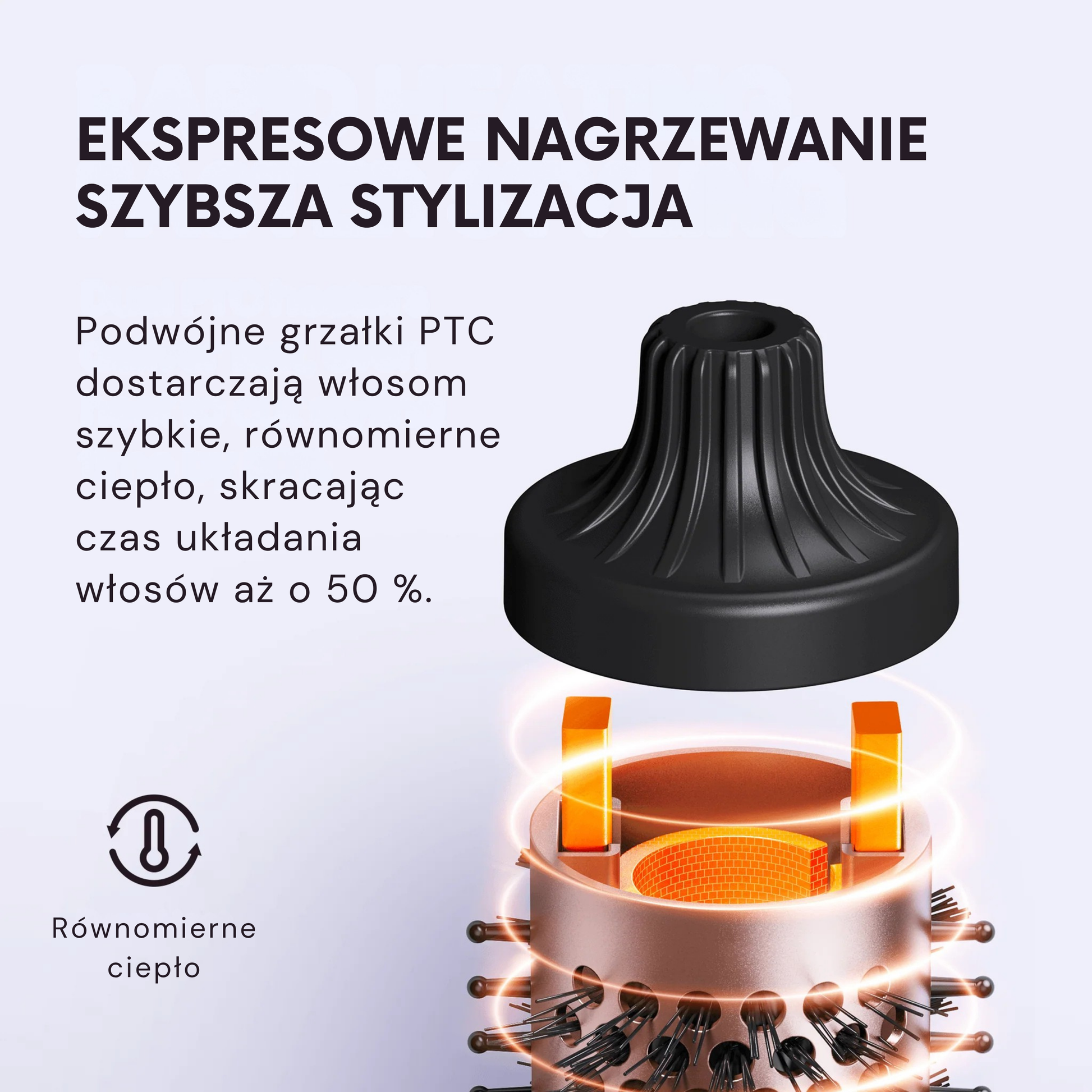 Podwójny element PTC osiąga wybraną temperaturę w niecałą minutę, więc możesz stylizować włosy niemal od razu po włączeniu.